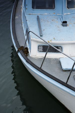 Blue and white fishing boat at anchor