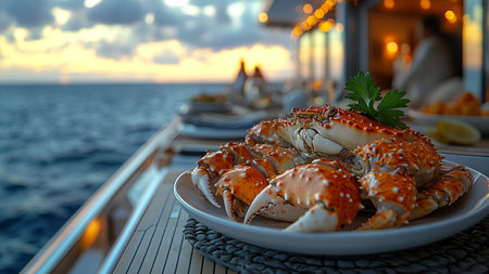 Steamed crab on the deck of a cruise ship at sunset.