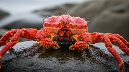 A large red king crab perches on a wet, dark rock near the sea. The image details the spiky texture of its shell and legs against a blurred coastal background.