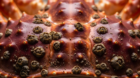 A highly detailed close-up of a King Crab shell, showcasing barnacles and a rough, spiky texture. The reddish-brown armor highlights the rugged and natural beauty of marine crustaceans.
