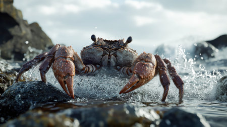 A striking close-up view of a crab navigating rocky terrain by the shore, with water splashing dramatically around it, showcasing its impressive claws and details.