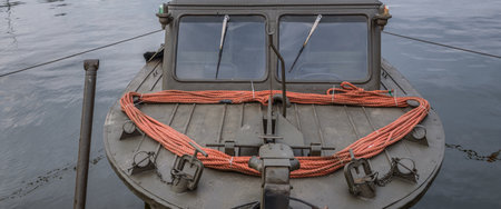 Fairhaven, Massachusetts, USA - March 15, 2020: Floats and stacks of traps loaded aboard lobster boat Intimidator