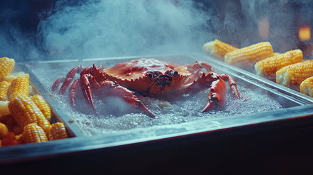 A vibrant steamed crab sits proudly on a platter accompanied by corn, surrounded by a cloud of steam, creating an irresistible culinary experience.