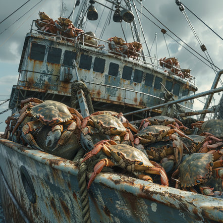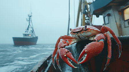 A vivid close-up of a red crab resting on a boat. In the background, a fishing vessel navigates through foggy waters, creating a unique marine atmosphere.