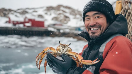 A joyful fisherman showcases his fresh catch of crab in a stunning winter landscape, blending the beauty of nature with the excitement of fishing adventures.