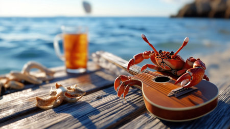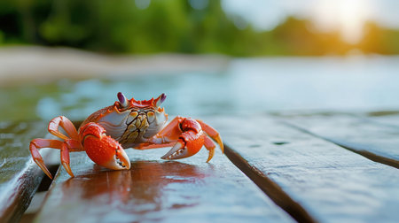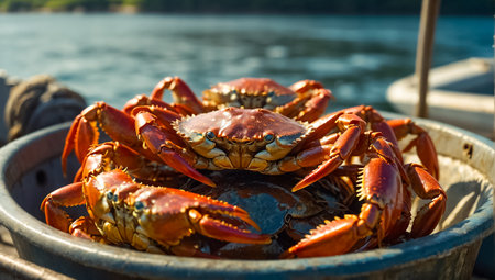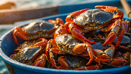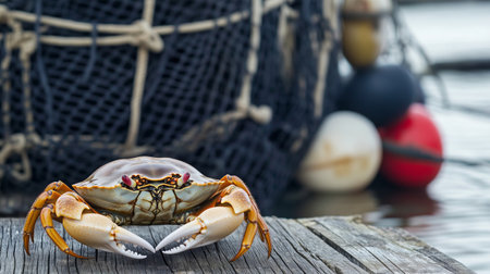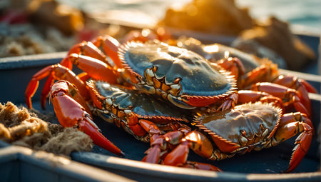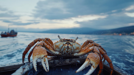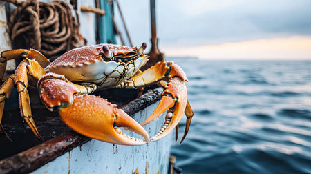 A freshly caught crab rests on a fishing boat, showcasing intricate details and vibrant colors. The serene sea and warm sunrise light create a captivating maritime scene.