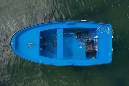 blue wooden fishing boat anchored in the sea, top view from drone