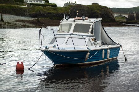 Small blue moored fishing boat with single cabin