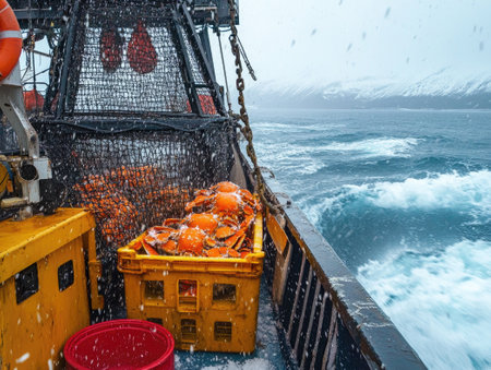 A hardworking fisherman wearing a yellow raincoat and waterproof gear strains to pull a heavy crab pot from the sea onto his commercial fishing boat. This action shot captures the physically demanding nature of the fishing industry and the daily labor of fishermen at sea.