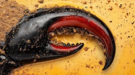 This macro photograph captures the striking details of a black crab claw, featuring glossy red highlights and a sandy backdrop, showcasing nature's beauty.