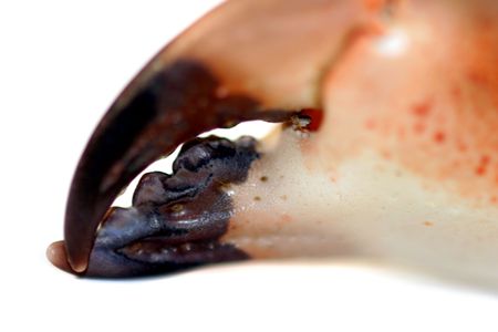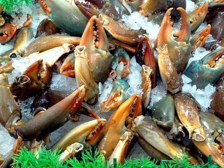 An extreme macro close-up of crab claws, revealing the rough, sandy texture and coloration. The detailed shot emphasizes the anatomy of the marine crustacean.