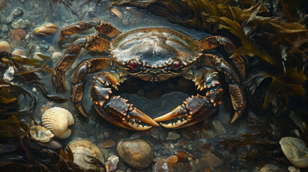 A stunning close-up of a crab showcasing its strong claws and intricate details. Captured in a natural habitat, this image highlights the beauty of wild marine life.