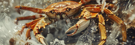 This close-up image showcases the intricate details of a crab, highlighting its textured shell and powerful claws. A vivid capture of marine wildlife.