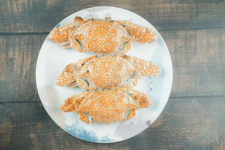 Big fresh steamed crab in plate on wood table. Thailand seafood