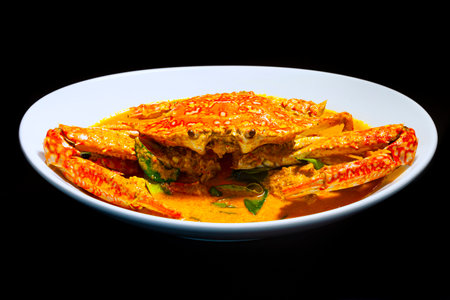 Blue crab curry in Thai infused red coconut curry sauce on dark moody background, selective focus.