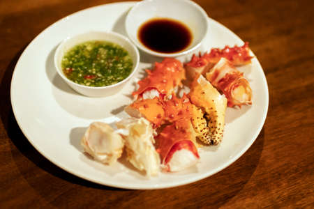 Crab meat / Cooked crab claws and legs on wooden and seafood sauce on the table , blue swimming crab