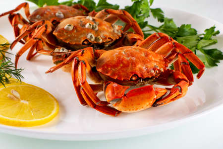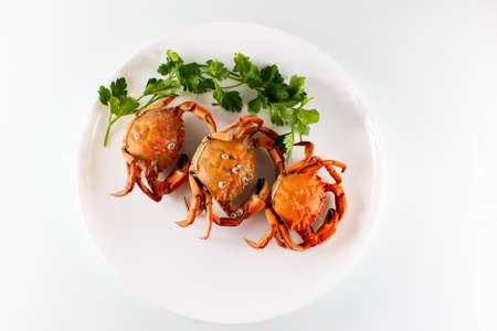 seafood crab cooking food boiled or steamed crab red in the seafood restaurant, fresh crab on white plate background
