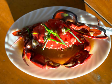 Freshly steamed blue crabs served whole on plate. Traditional Thai seafood delicacy