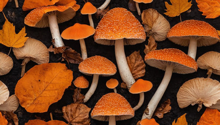 A close-up, overhead view of a collection of vibrant orange mushrooms and dried autumn leaves scattered across a dark, textured surface. The mushrooms vary in size and shape, with some featuring distinctive white stems and speckled caps. The fallen leaves are in shades of orange and brown, adding to the autumnal atmosphere. The dark background creates a strong contrast, highlighting the intricate details and rich colors of the fungi and foliage. captures the essence of a forest floor during...