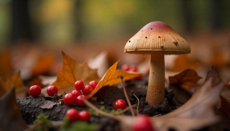 Autumn mushroom surrounded by berries and fallen leaves