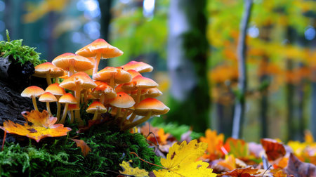 A close-up of mushrooms growing on the forest floor, surrounded by fallen autumn leaves, in warm, golden sunlight, evoking the natural beauty of forest ecosystems.