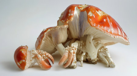 This striking mushroom features a vivid red cap and claw-like structures, resembling a crab. It stands prominently with intricate patterns and textures at its base.