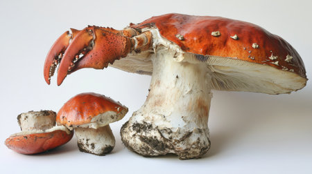 A striking crab-shaped mushroom with an eye-catching red cap stands alongside two smaller mushrooms, highlighting the unusual designs found in nature.