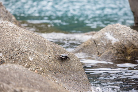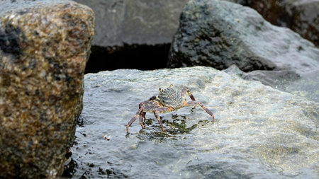 Sea animal Crab - Brachyura climbing on a stone by the sea