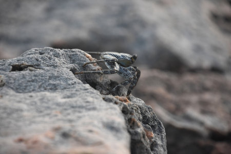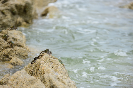 Small crabs crawling on the rocks on the shore. Coral reef wildlife