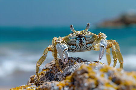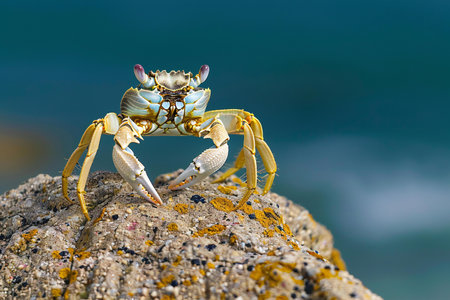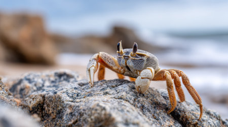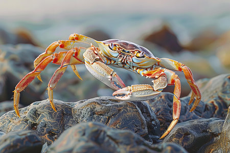 A vibrant crab perched on a rock by the ocean, showcasing its colorful shell and the surrounding environment, illustrating the beauty of marine life and coastal ecosystems.