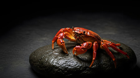 A vibrant red crab stands on a wet, dark stone surface, illuminated by a dramatic spotlight. The contrasting colors and textures highlight the marine creature's detailed shell and claws against the moody background.