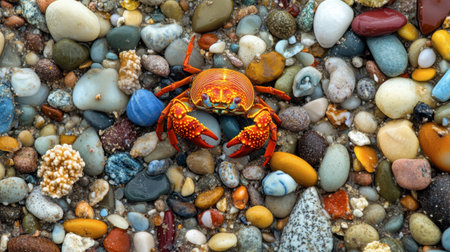 A bright red crab stands out against a variety of colorful pebbles on the shore. This vibrant scene captures the beauty of coastal wildlife and natural habitats.