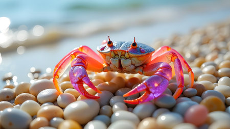 A vibrant crab rests on colorful pebbles along a sunny beach, showcasing the beauty of coastal wildlife. This serene moment captures the essence of nature's wonders.