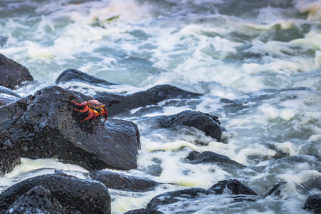 Red crab on the cliff close to the ocean on the Canary Islands.