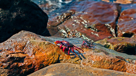 Red crab with white spots among the rocks on Las Canteras beach, in Las Palmas, Spain. Animal concept
