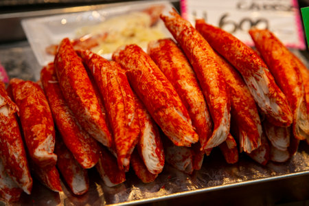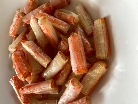 Fresh Crab Sticks Surimi Ready to Eat. Fast Food.