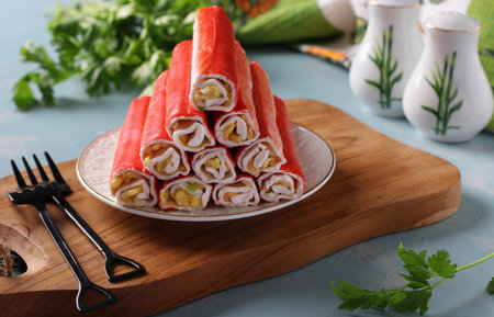 Crab sticks with lettuce and dill on brown wooden cutting board