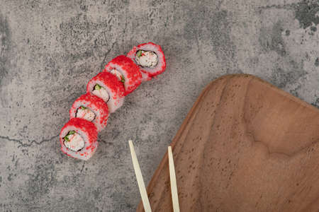 California sushi rolls with a wooden board and chopsticks on stone table