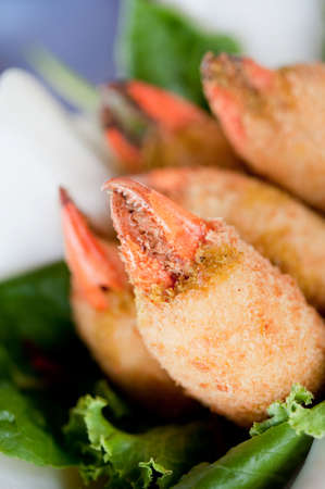 Fried crab in the dish. Lay on the table with a banana leaf.