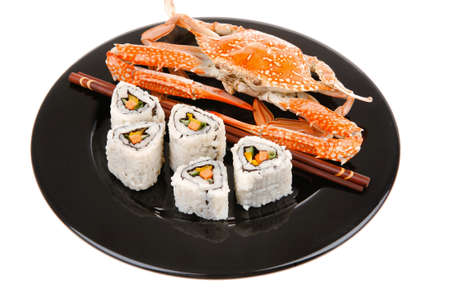 Sushi Maki Roll with Vegetables and Salmon inside . on black dish with boiled crab . Japanese Cuisine