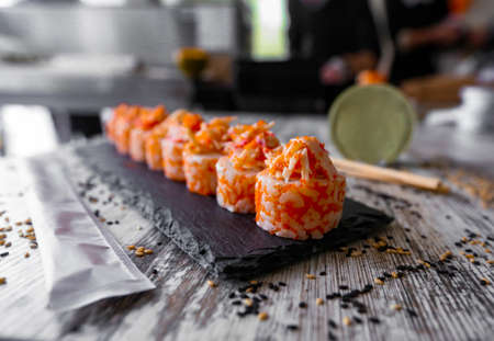 Crab sticks Sushi Japanese Food Style, Crab sticks Sushi roll on the black desk and white table