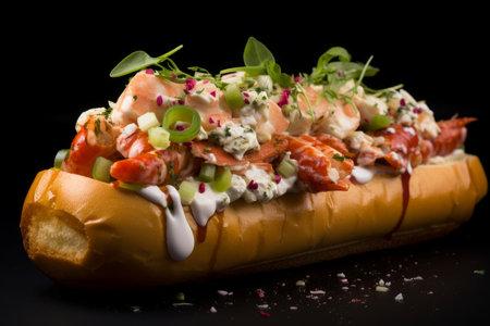 Grilled hot dogs with shrimps, tomatoes, eggs and sauce on a board on a table