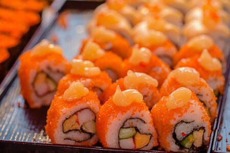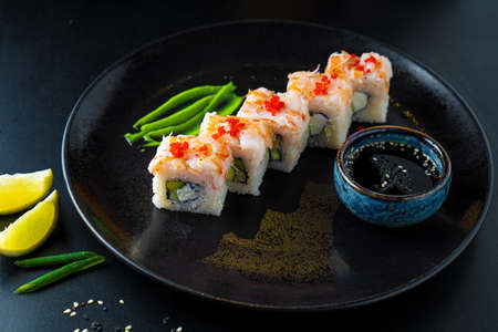 Close Up on serve baked sushi rolls with eel and tobiko caviar on black slate board