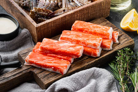 Fresh Crab meat stick surimi with blue swimming crab set, on stone board, on black background, with copyspace and space for text
