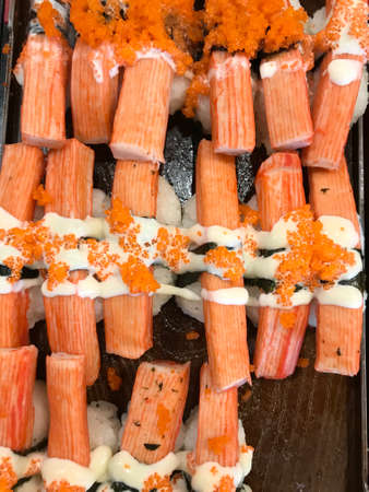Sushi menu set Japanese cuisine fresh ingredients on tray / Japanese food sushi crab stick with nori roll in the restaurant