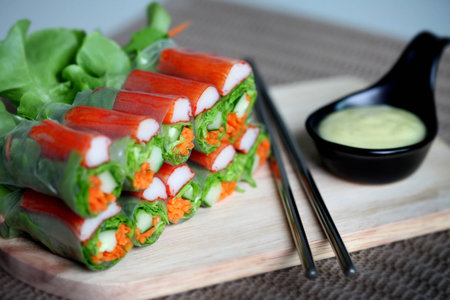 Fresh salad rolls with crab on wood plate