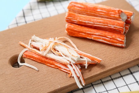 Cutting board with pile of crab sticks on wooden table