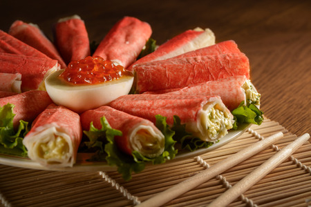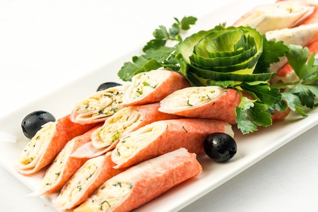 Crab stick in salad roll on white dish. Healthy food concept.