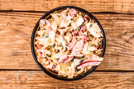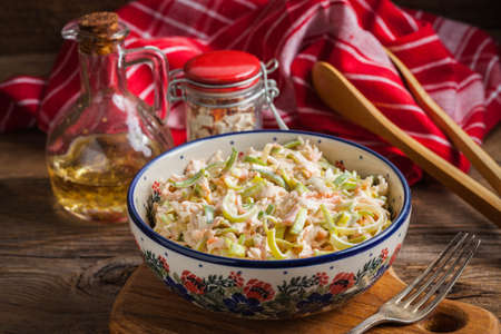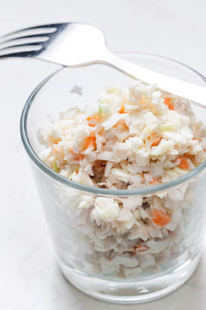 Coleslaw Salad From Cabbage, Carrots and Dressing Mayonnaise in Bowl. Traditional Fresh Food.