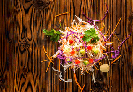 Top view of finely chopped white, red cabbage, carrot decorated red pepper, cucumber, parsley over wooden background, concept healthy eating